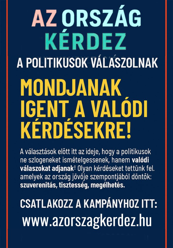 Célunk, hogy a politikusok a 2026. évi országgyűlési választások előtt szembesüljenek azzal, mit gondolnak az emberek a számukra legfontosabb nemzeti kérdésekről. Ehhez azonban több százezer szavazat kell, minél többen töltik ki ezt a kérdőívet, annál erősebb a társadalmi üzenet!